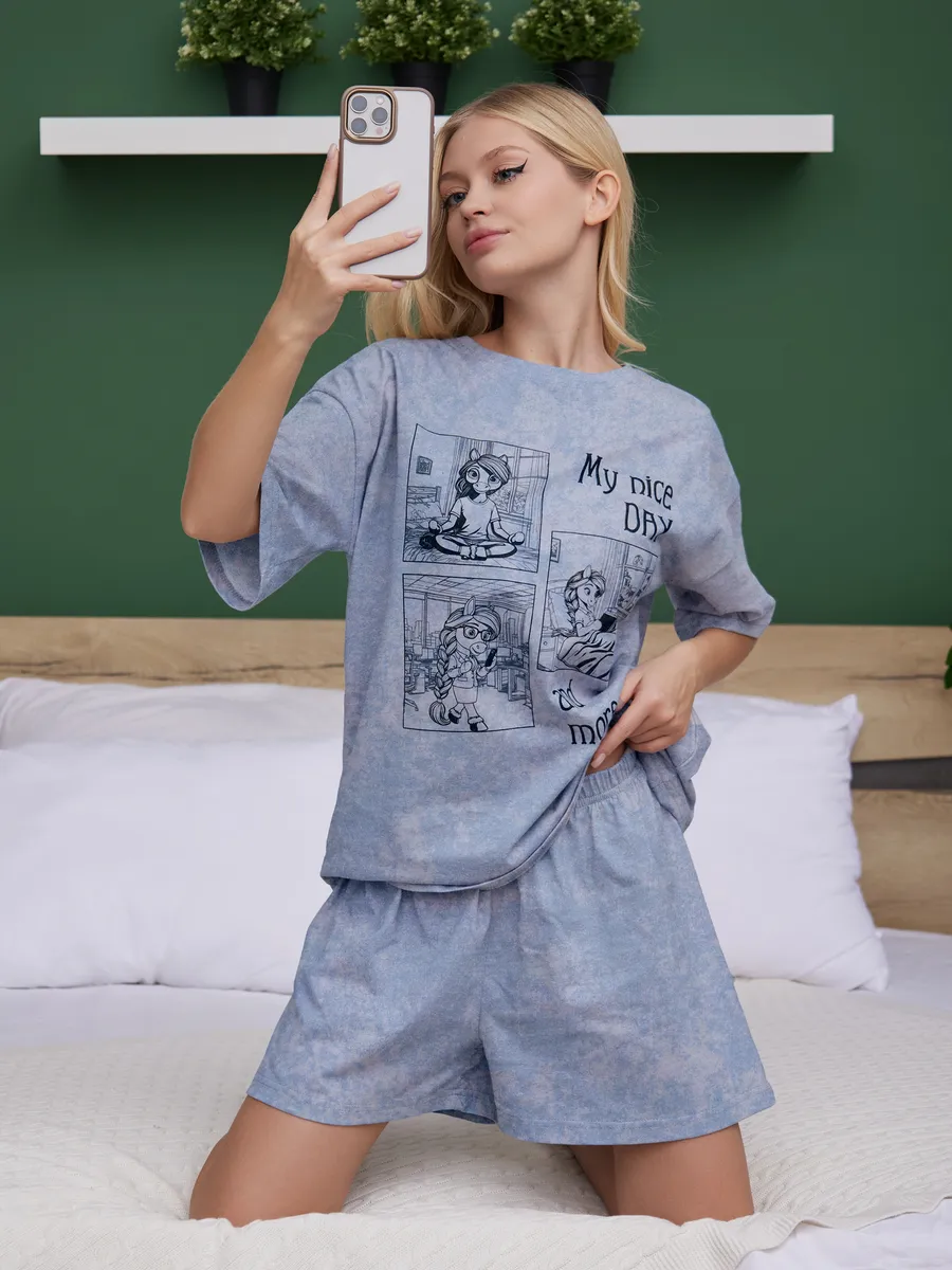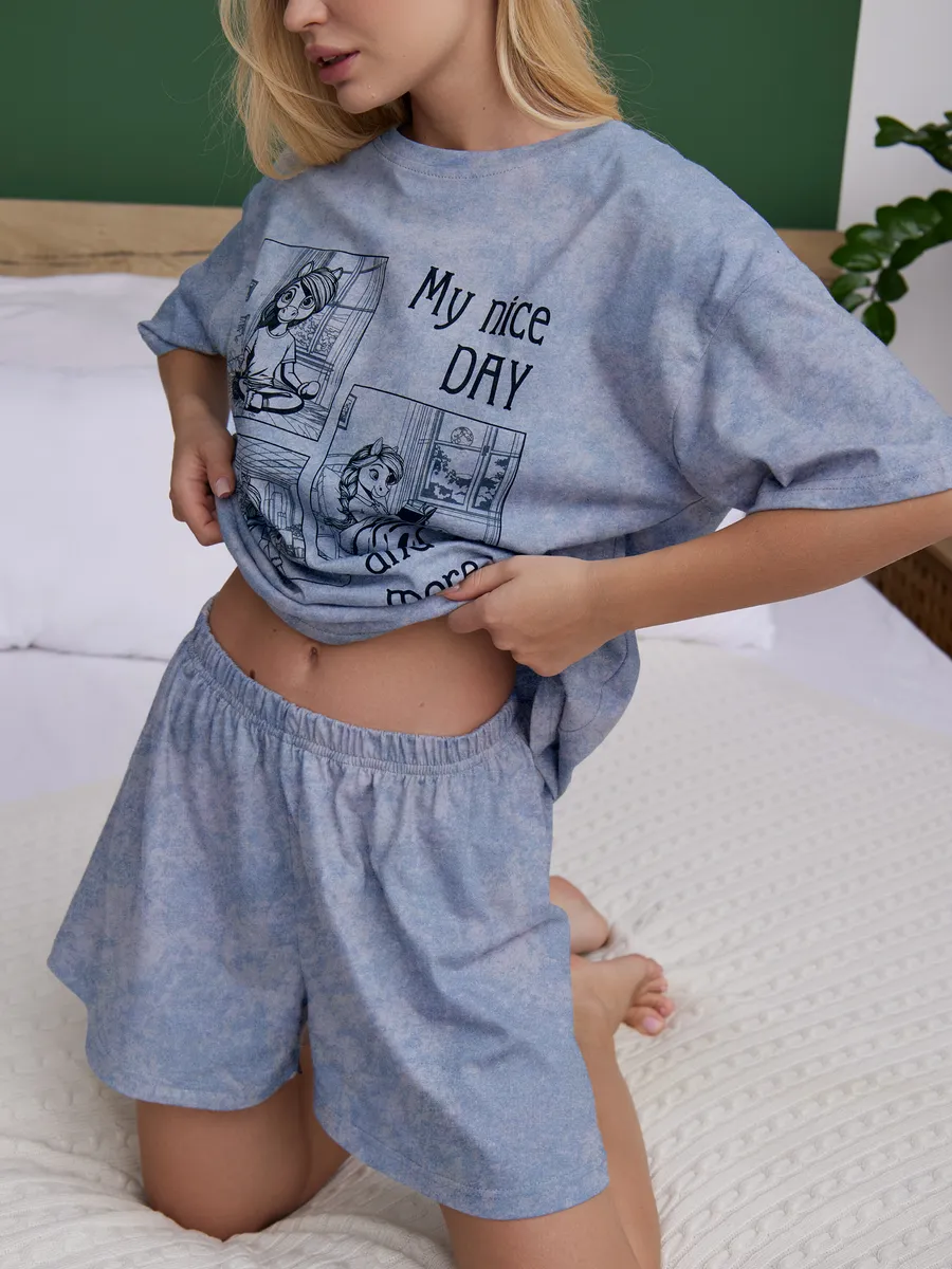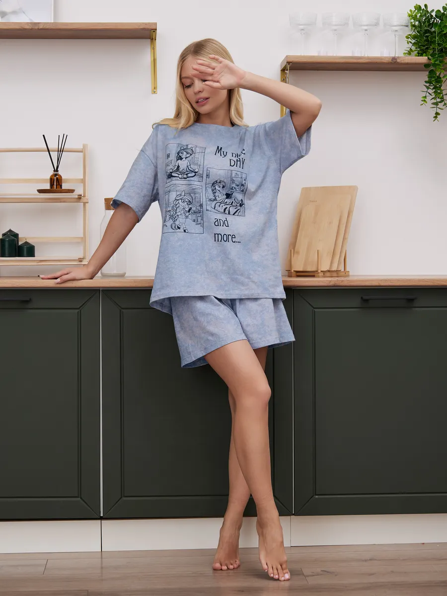 Костюм выполнен в оверсайз стиле, удобный, не сковывает движения и подходит для сна, отдыха и уютных вечеров. Красивая и женственная модель с милым принтом выглядит эстетично и отлично вписывается в тренды Pinterest. Нарядная, но в то же время повседневная одежда подойдёт для фотосессии, домашней вечеринки или просто комфортного отдыха.