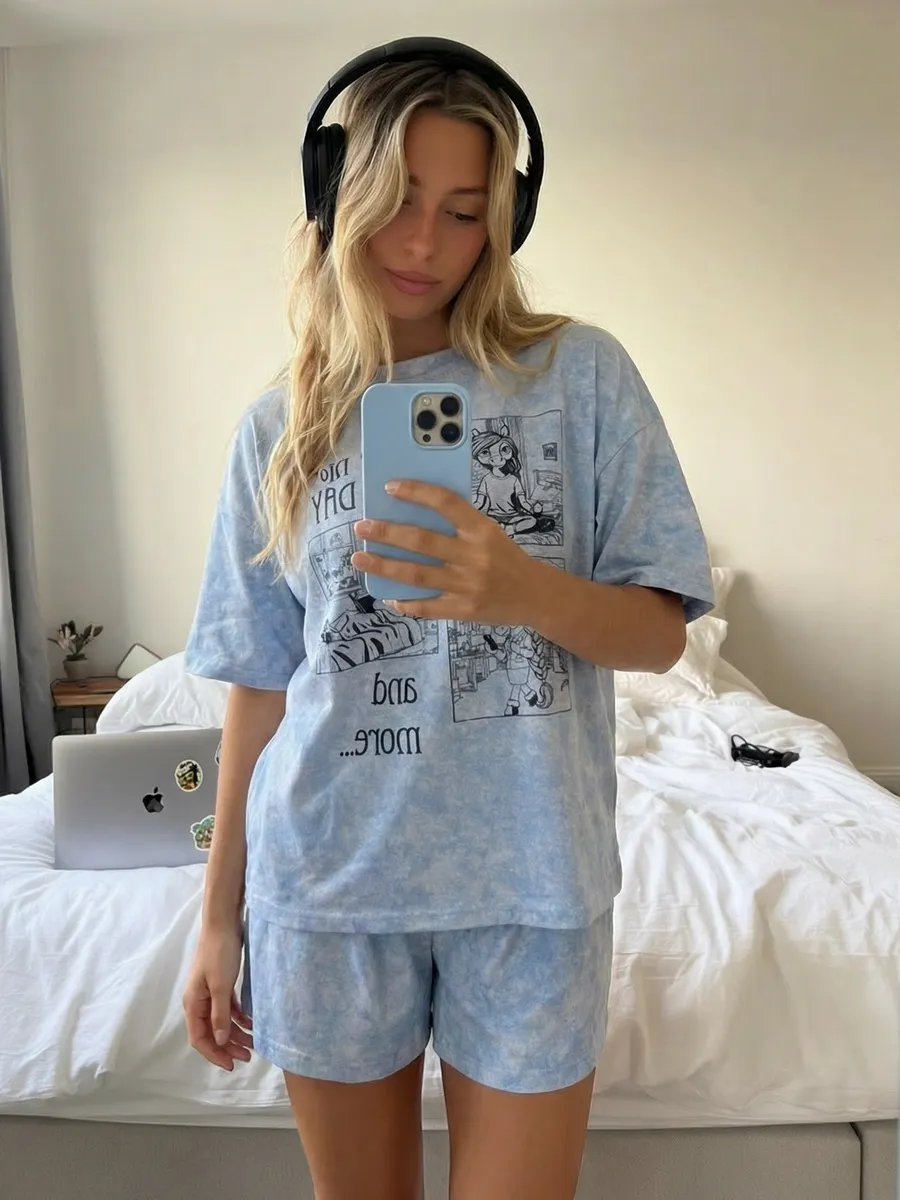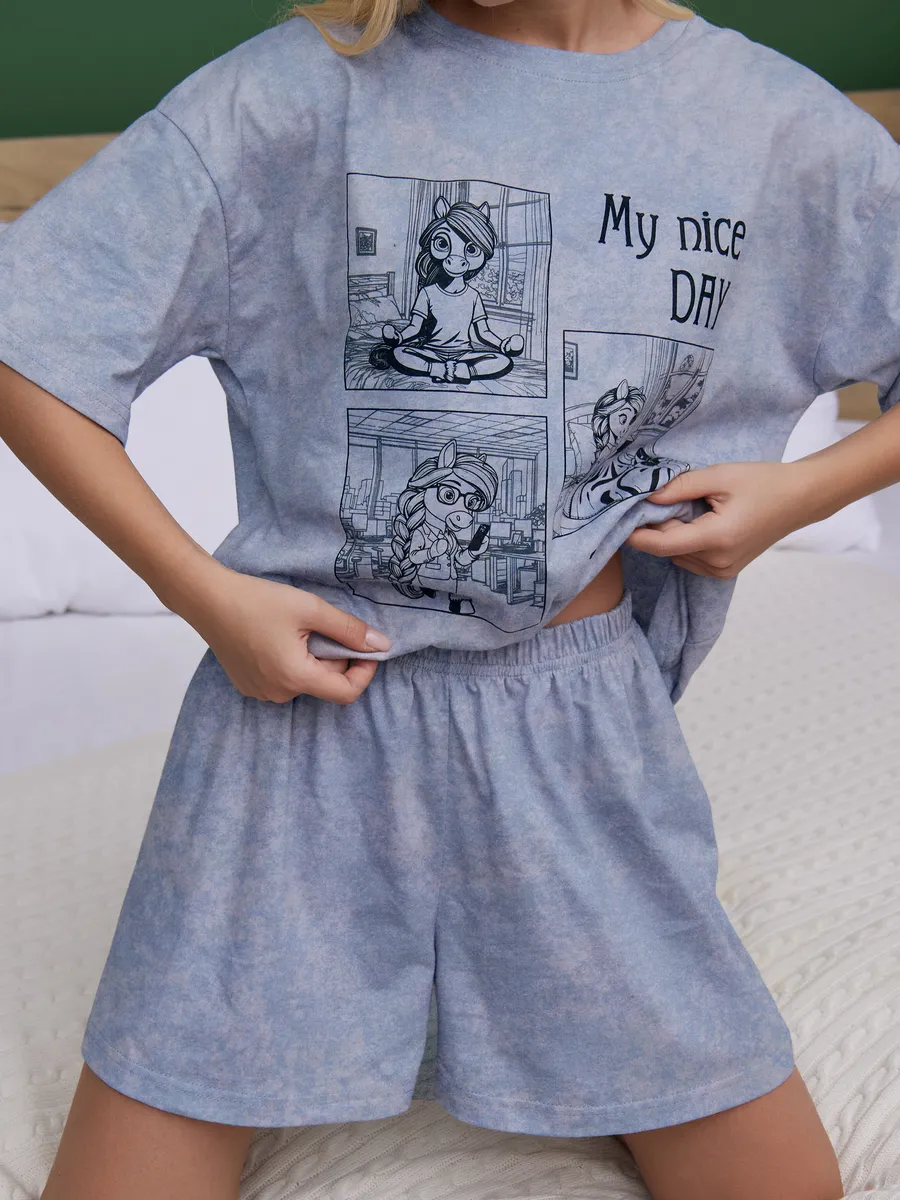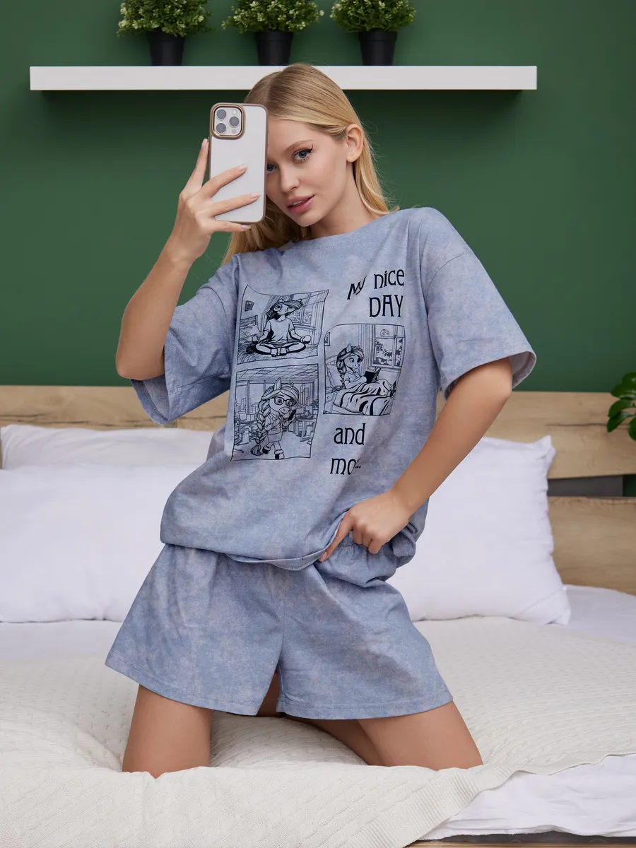 Костюм выполнен в оверсайз стиле, удобный, не сковывает движения и подходит для сна, отдыха и уютных вечеров. Красивая и женственная модель с милым принтом выглядит эстетично и отлично вписывается в тренды Pinterest. Нарядная, но в то же время повседневная одежда подойдёт для фотосессии, домашней вечеринки или просто комфортного отдыха.